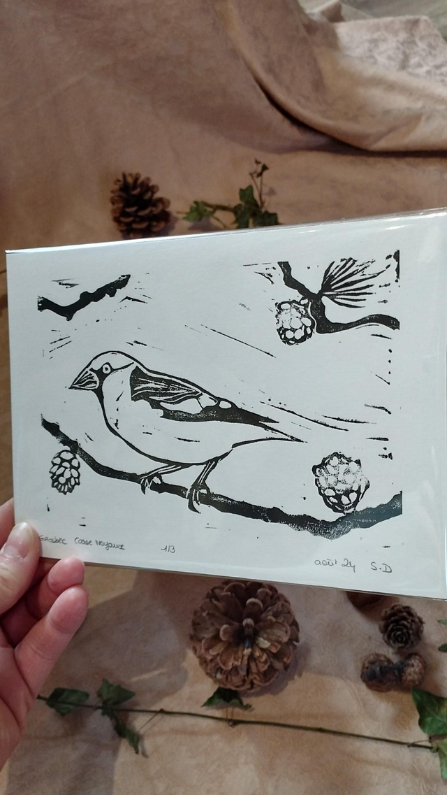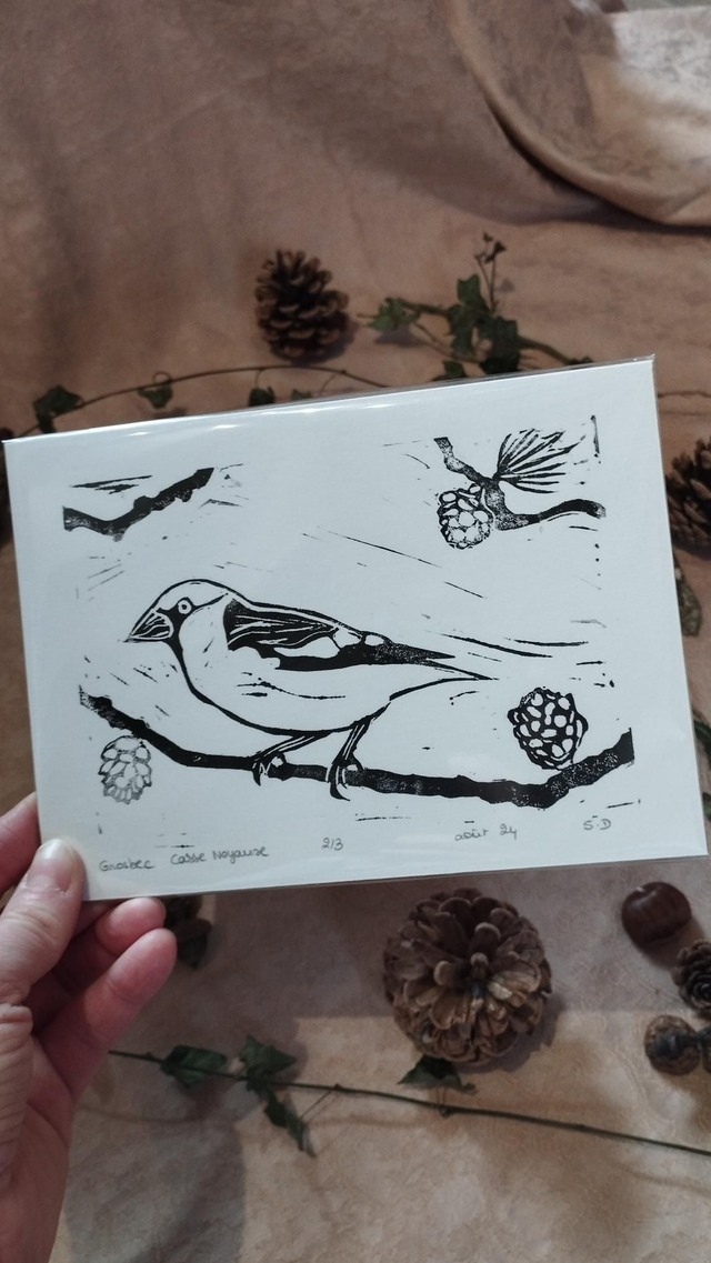 Illustration Oiseau Gros bec Casse noyaux en linogravure