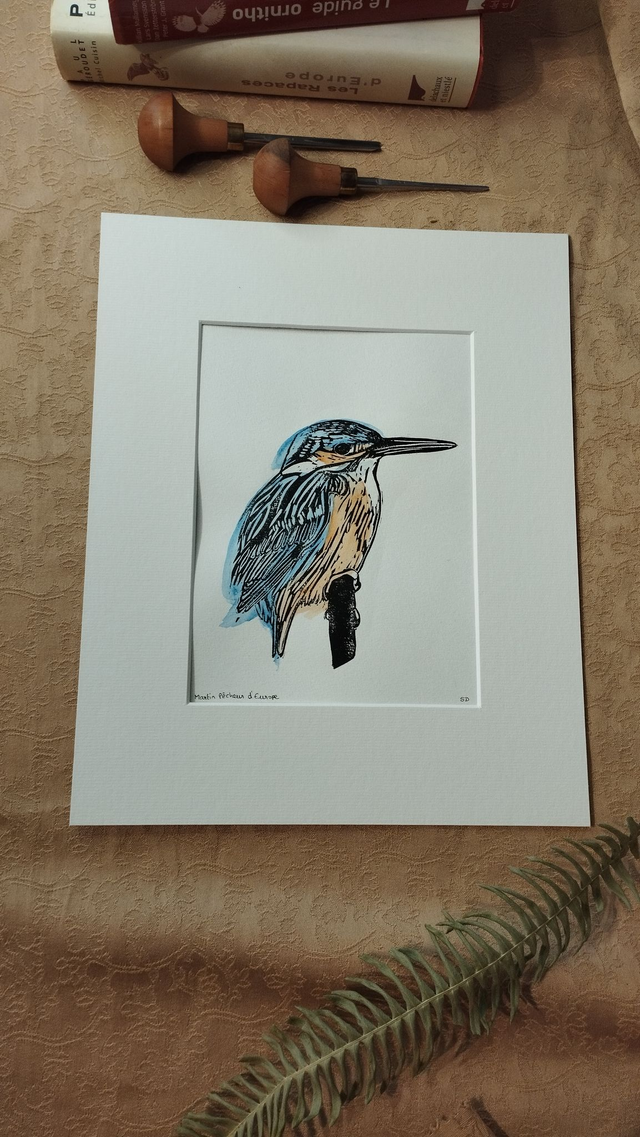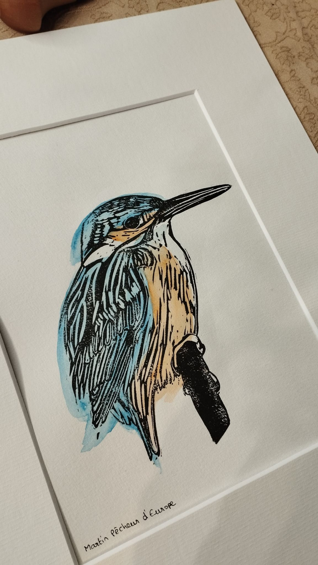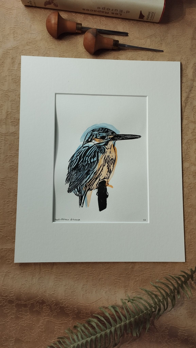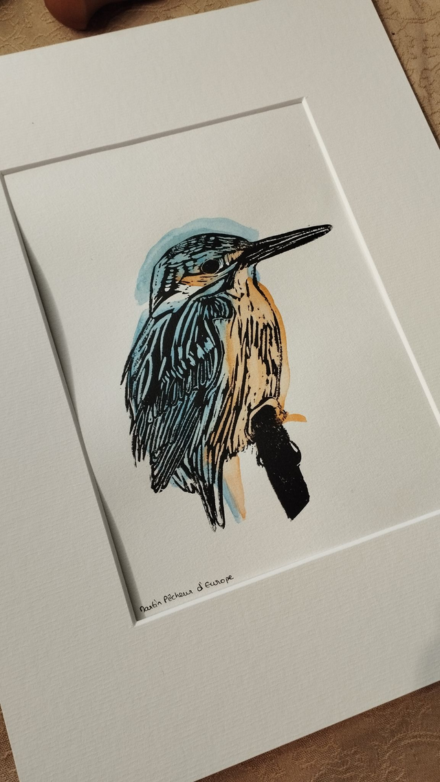 Illustration Oiseau Martin-Pêcheur d'Europe en linogravure et aquarelle