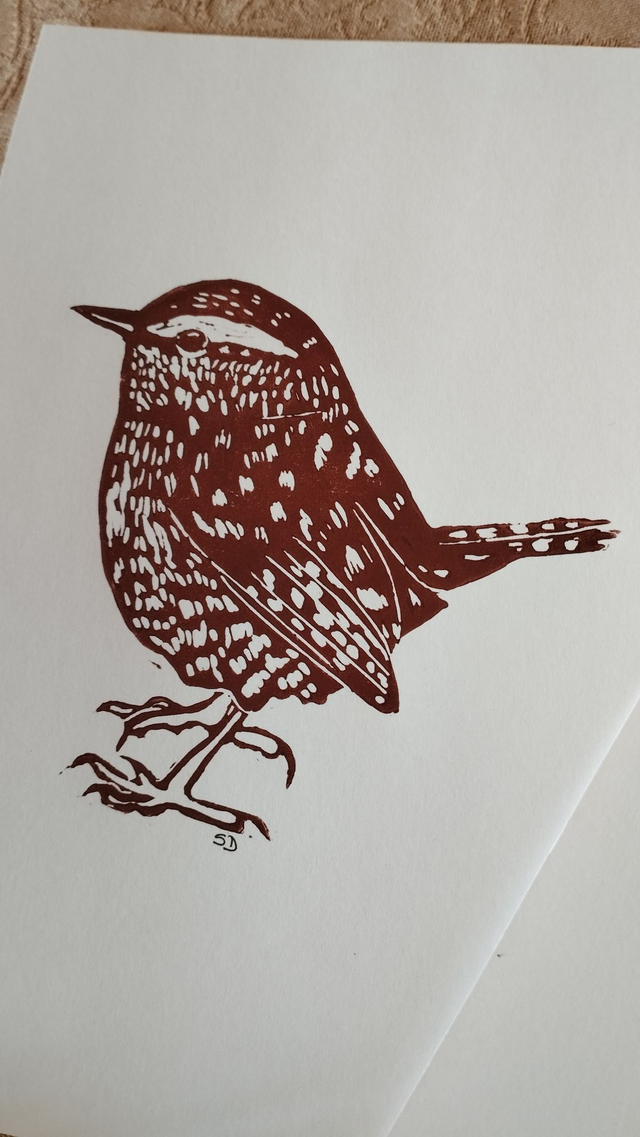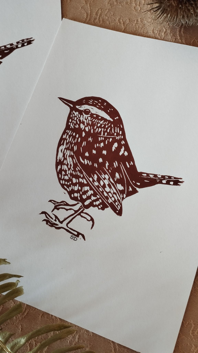 Illustration Oiseau Troglodyte mignon en Linogravure, couleur marron