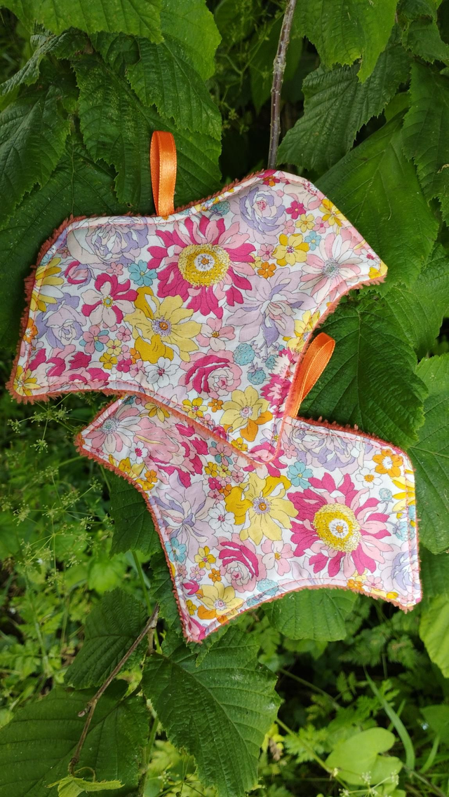 • Matériaux : Coton motif liberty fleuri et éponge en bambou orange, avec un petit ruban pour décorer ou accrocher.