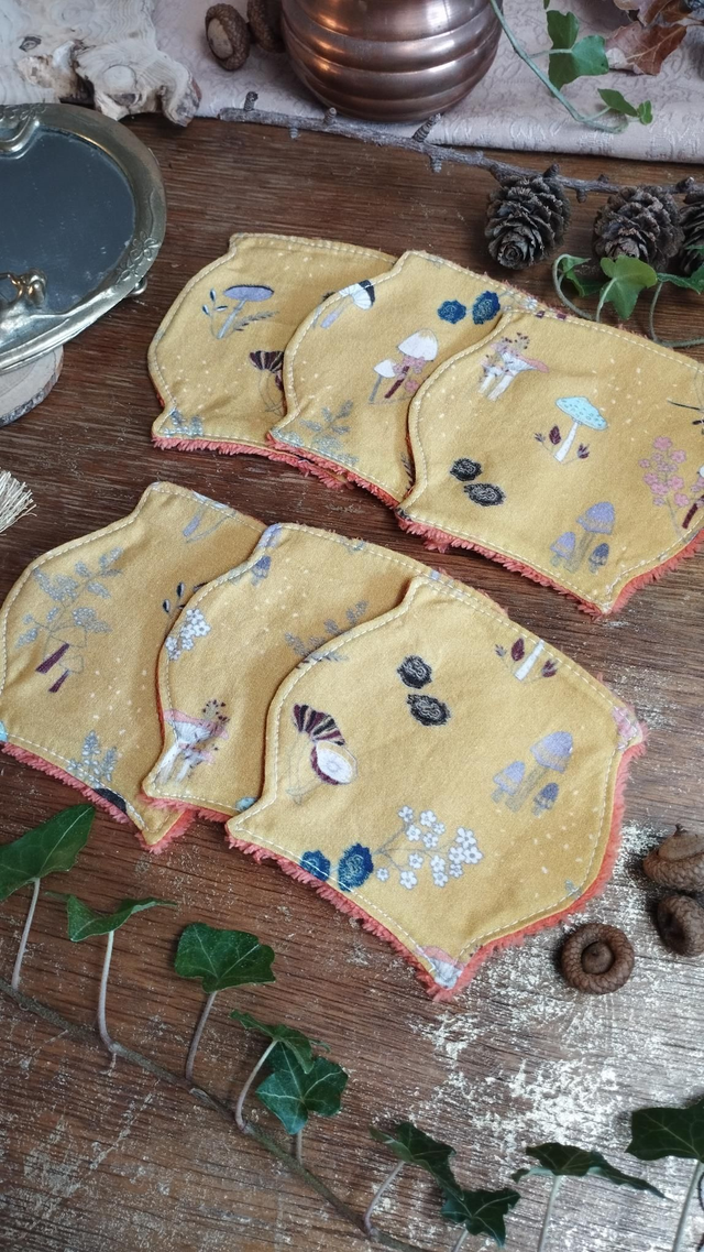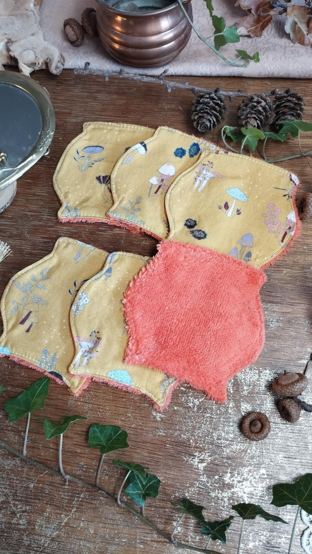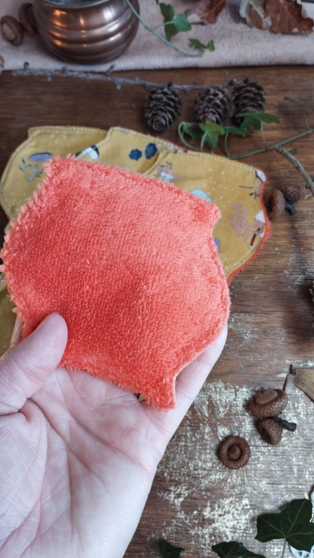 - Matériaux : Coton motif champignons, automne et forêt, et éponge en bambou orange.