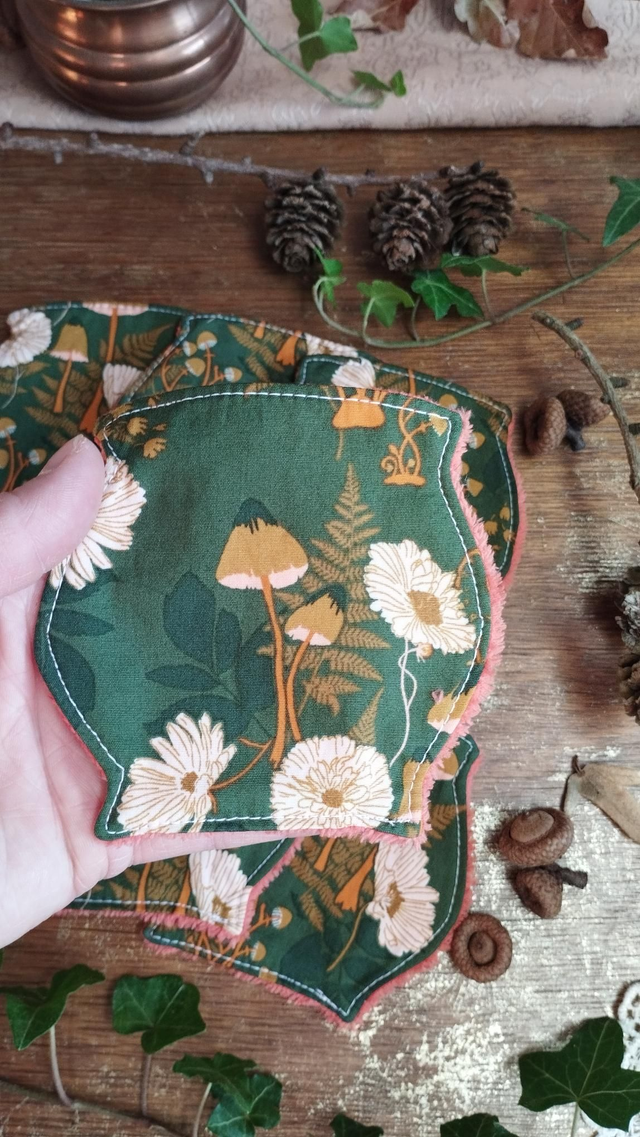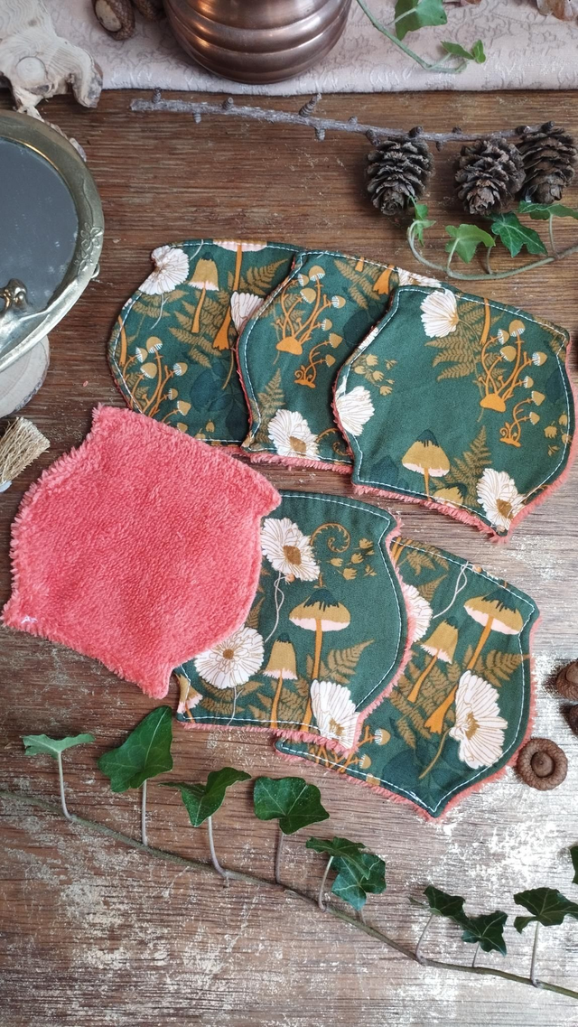 Lot de 2 lingettes pour le démaquillage, tissus champignons fond vert