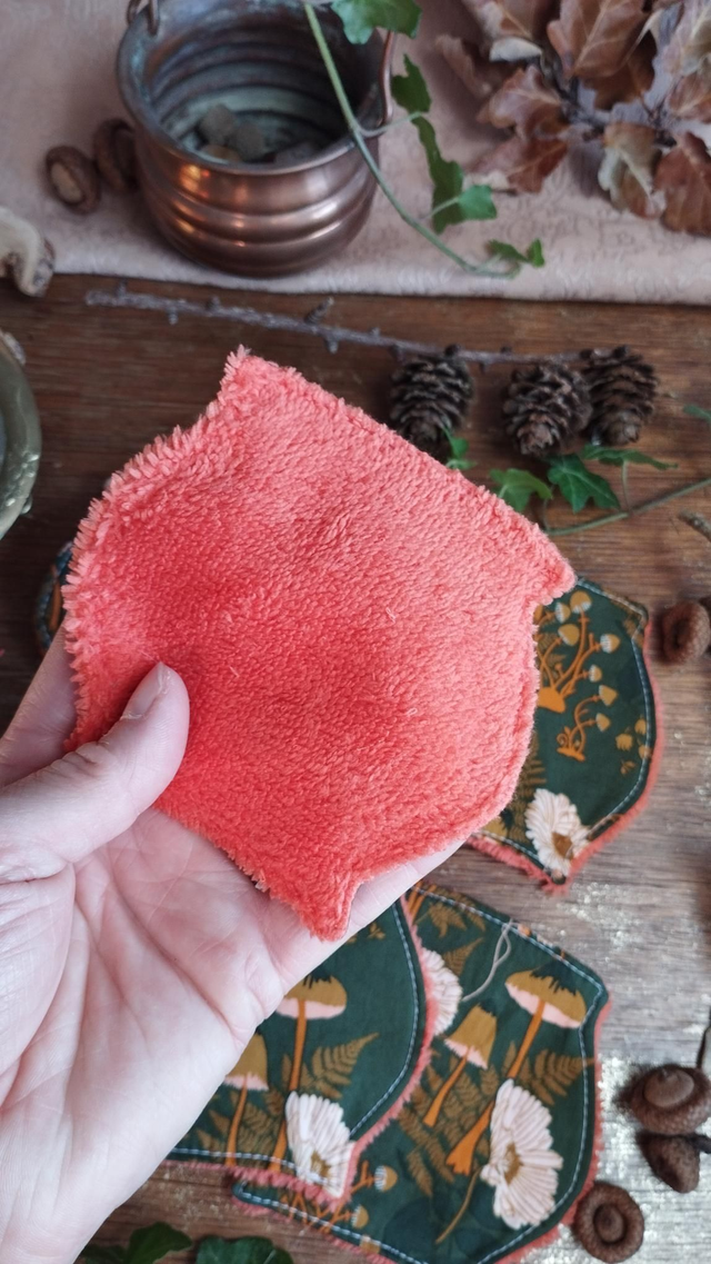 - Matériaux : Coton motif champignons et fougères, et éponge en bambou orange.
