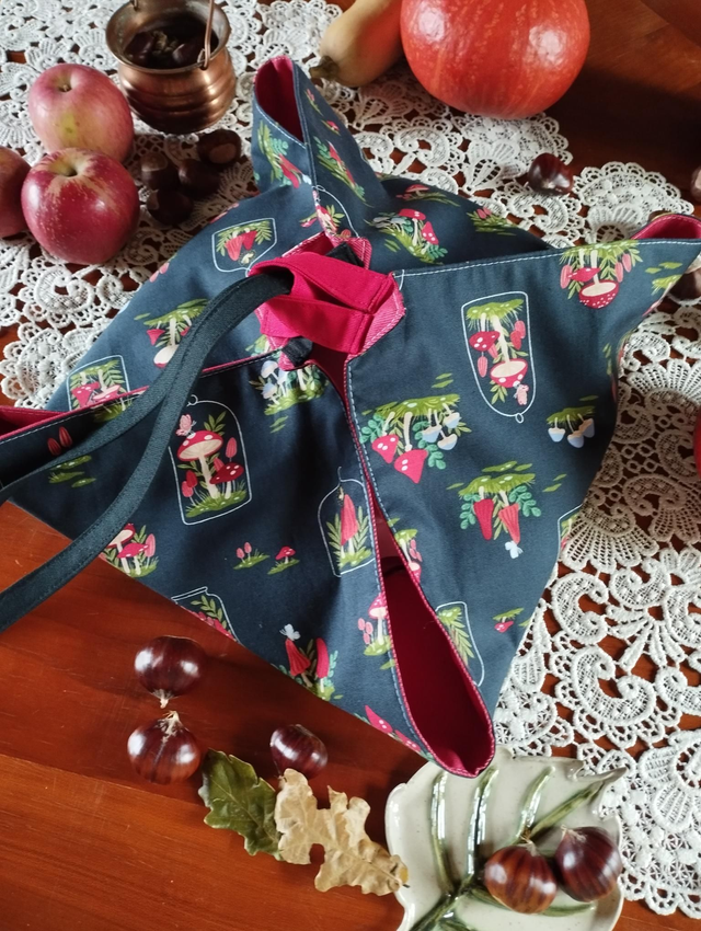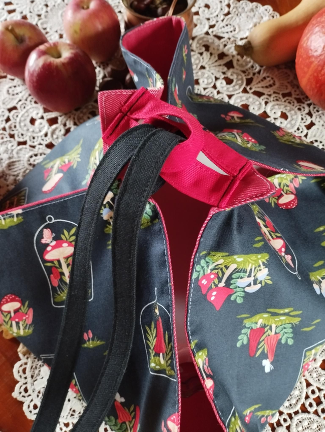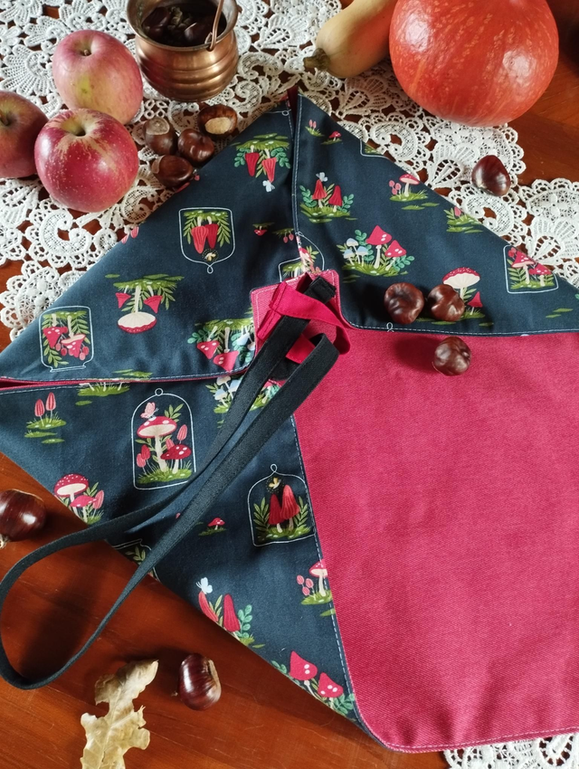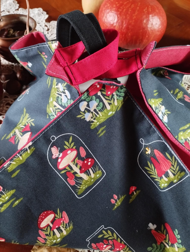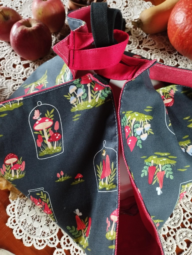 - Matériaux : Tissu en coton avec motifs champignons, fougères et papillons.