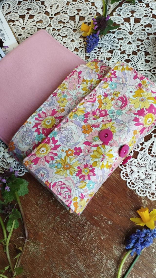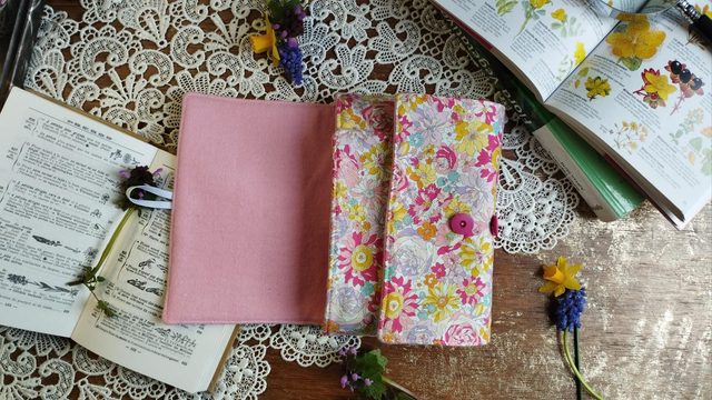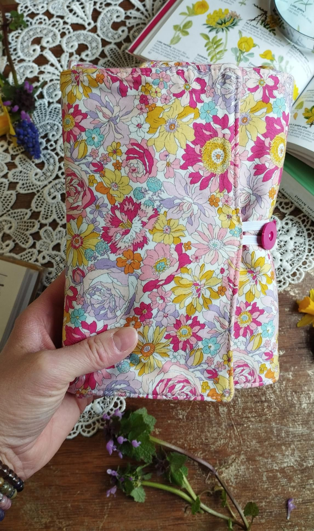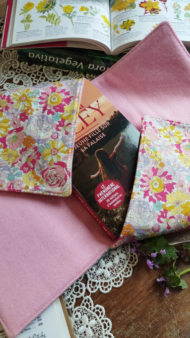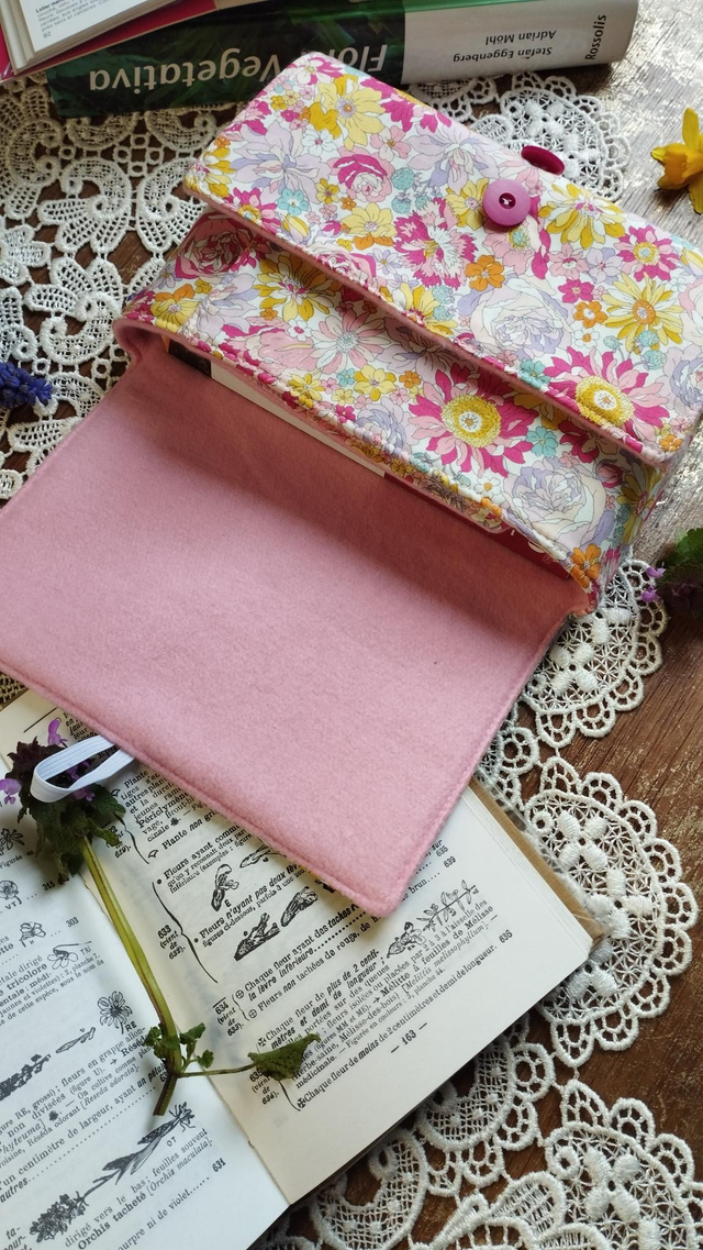 • Matériaux : tissus extérieur en coton, motif liberty fleuri printanier, tissus intérieur en polaire tout doux pour protéger votre livre préféré.
