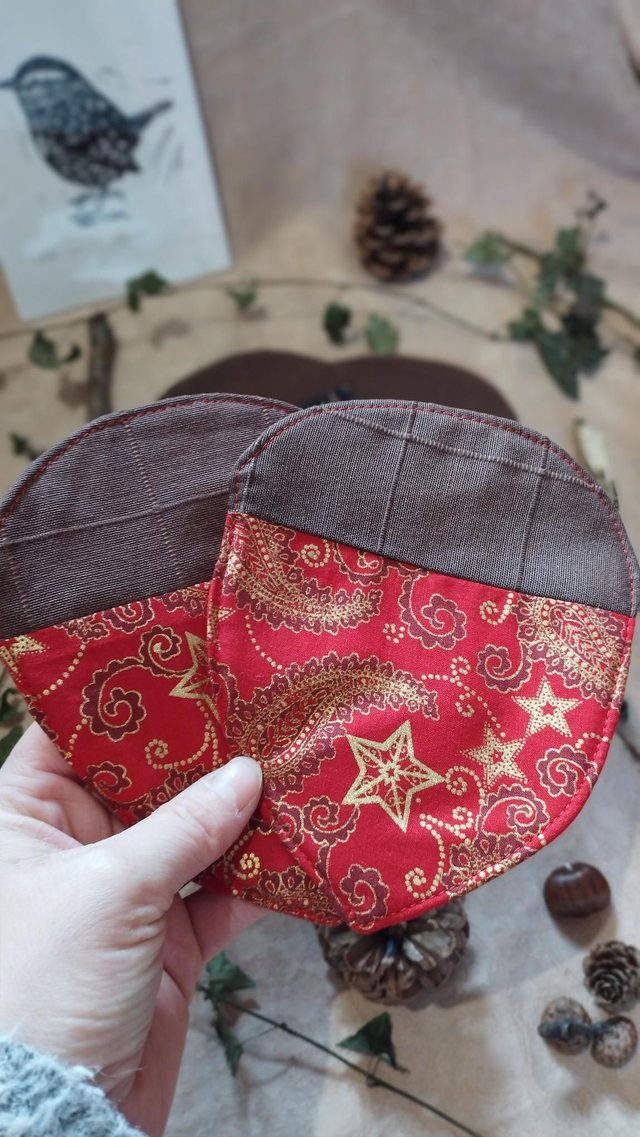 Ajoutez une touche hivernale à votre table avec le dessous de tasse en forme de gland. Ce dessous de tasse est confectionné avec un tissu marron et un tissu à motif Noël oriental, doré, parfait pour protéger votre table des boissons chaudes.